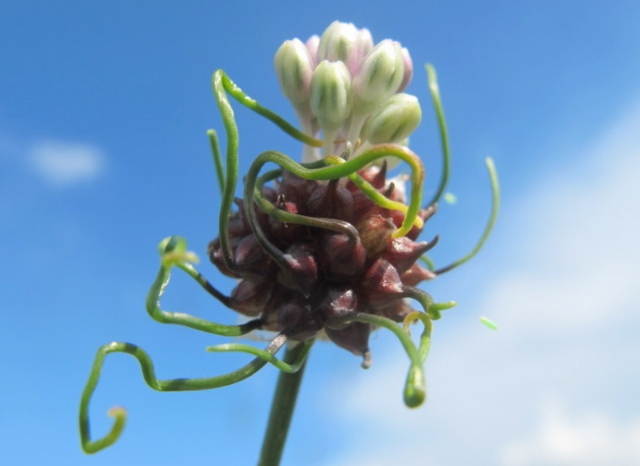 Główki kwiatowe pojawiające się około lipca są znacznie bardziej widoczne. Przybierają wygląd piłeczek pokrytych błoniastą okrywą, która po odchyleniu odsłania gęste skupisko fioletowoczarnych, maleńkich „cebulek”.